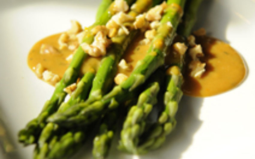 Pour sauce over plated asparagus and sprinkle with toasted walnuts.