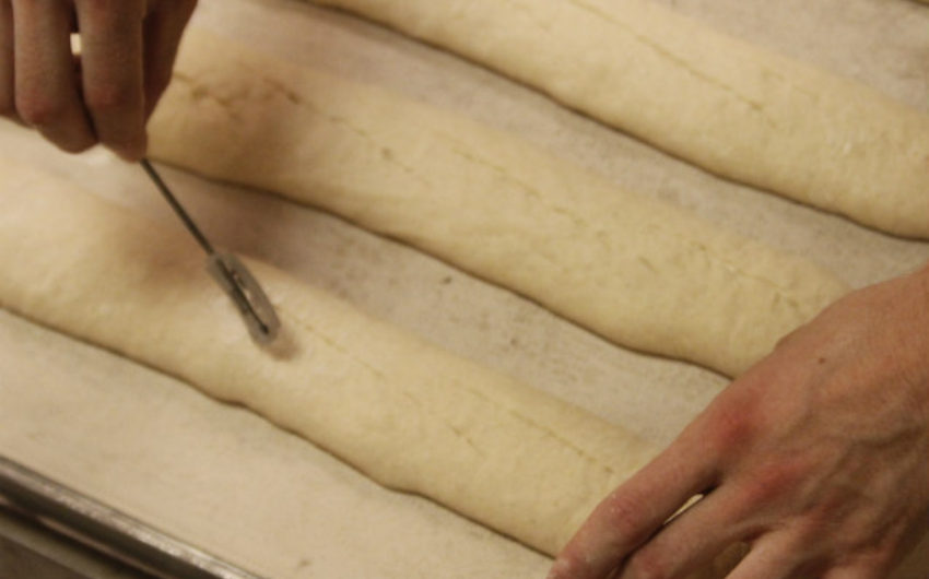 With two hands, stretch each piece of dough gently, wiggling until 12 inches or so long. Place two loaves on a wooden paddle or the back of a sheet pan dusted with flour. Place the other two back on the pan used for proofing. Gently score the loaves diagonally all the way down their lengths with a razor blade or serrated knife. Be careful not cut too deep. Re-cover the two baguettes on the pan until their turn to be baked.
