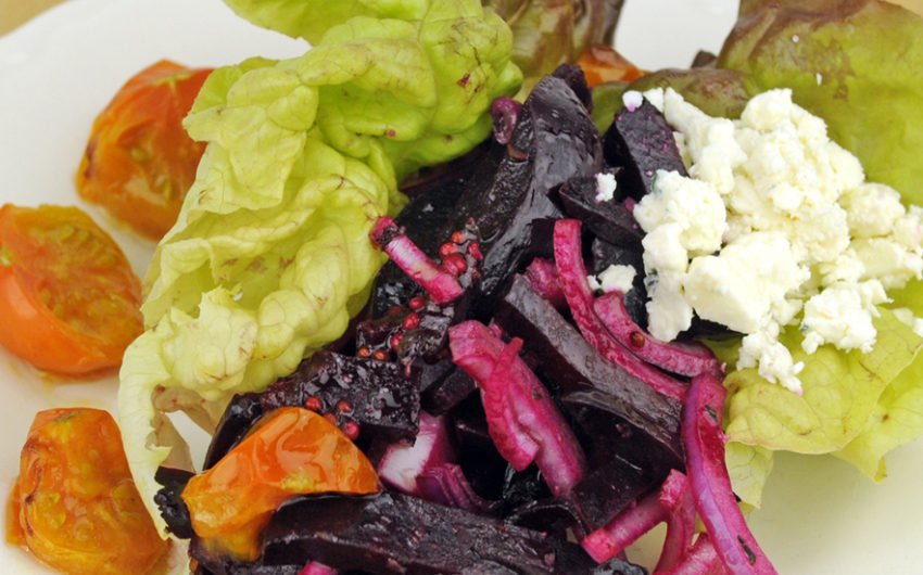 Peel and slice beets, then cut into matchsticks. Cut the red onion half through its root end into two pieces, then slice very thinly. Gently combine beets, onions and just enough vinaigrette to coat beets. Again add salt and pepper, as needed.