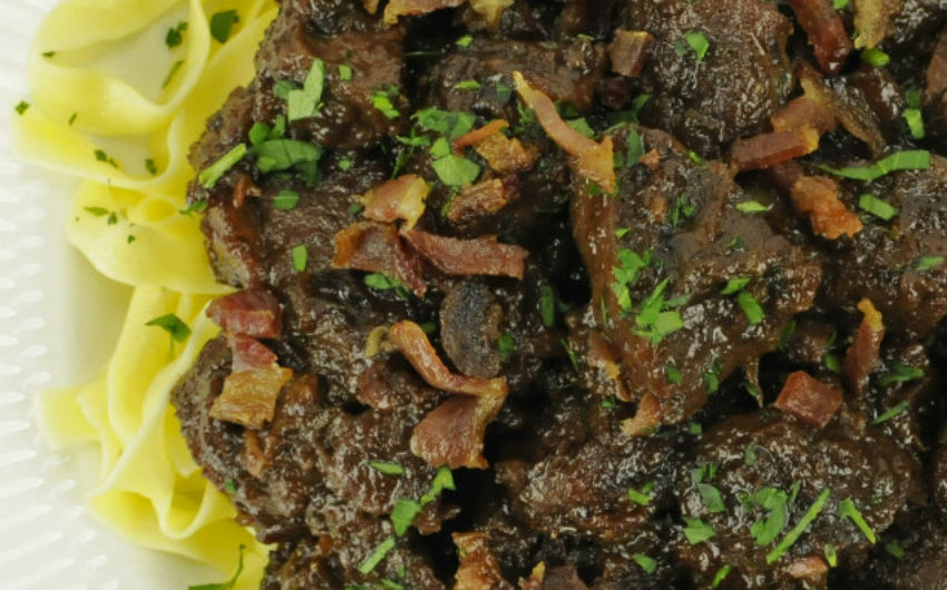 Remove from oven and let stand 20 minutes (or cool and refrigerate overnight). Skim fat from surface. Return to simmer on top of stove. Combine cornstarch and vinegar; stir into stew to thicken it. Season with salt and pepper. Serve over noodles, garnished with parsley and reserved bacon.