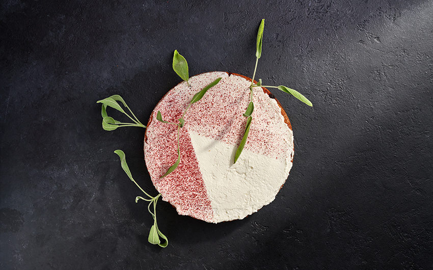 Once the cake is cooled to room temperature, spread whipped cream on top and adorn it with herbs, fruit, berries and/or flowers. (In the photo below, we grated freeze-dried raspberries through a sieve over the whipped cream and garnished the cake with sage.)