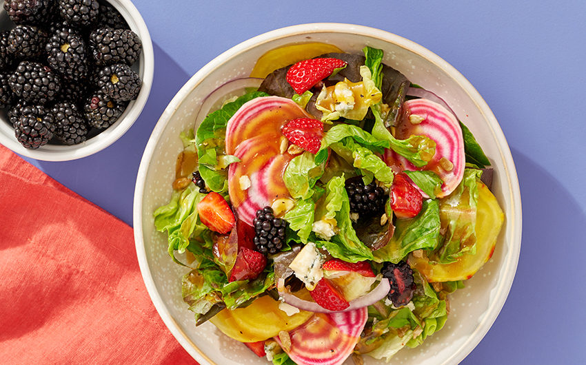 Divide the lettuce among bowls for serving. Top with the beets, onion, strawberries, blackberries and basil. Drizzle the salad with the dressing and finish with blue cheese and sunflower seeds.