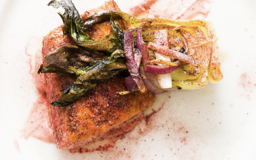This recipe uses a three step restaurant style of cooking. We start by seasoning and searing in a pan, then a quick roast in a hot oven, finishing with a brown butter baste. I like to serve the salmon with spicy roasted baby bok choy and a swirl of a simple Hart-Beet mayonnaise.