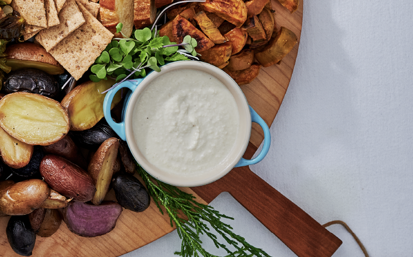 Add the cashews to a food processor with the garlic and remaining ½ cup water. Blend until smooth, about 2 minutes. Add the lemon juice, olive oil and salt, and blend until just combined. Serve warm or chilled..
