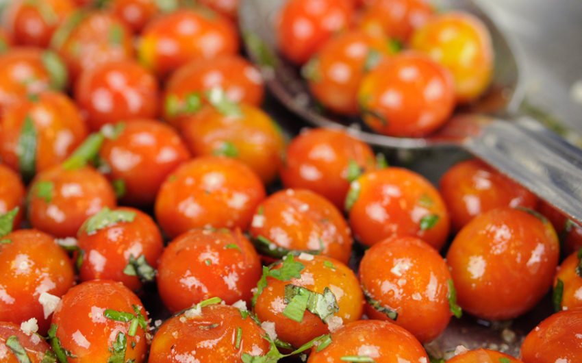 Remove stems from tomatoes; rinse and then gently dry them with towels. Heat butter in large skillet over mediumlow flame. Add tomatoes and shake the pan to coat them with butter. Keep shaking the pan occasionally as you warm the tomatoes until they are glossy and fragrant, 3 to 4 minutes.