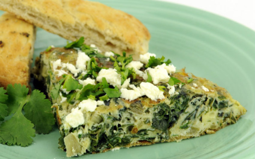 Add remaining ½ tablespoon butter to pan. Wearing oven mitts, invert the hot pan over the top of the frittata (don’t worry; the melted butter will drip onto the frittata). Grasp the pan-platter construction with both hands to hold it together and then flip it upside down. The frittata will now be back in the pan on its second side. Sprinkle with feta and return it to the heat for a moment or two to finish cooking.