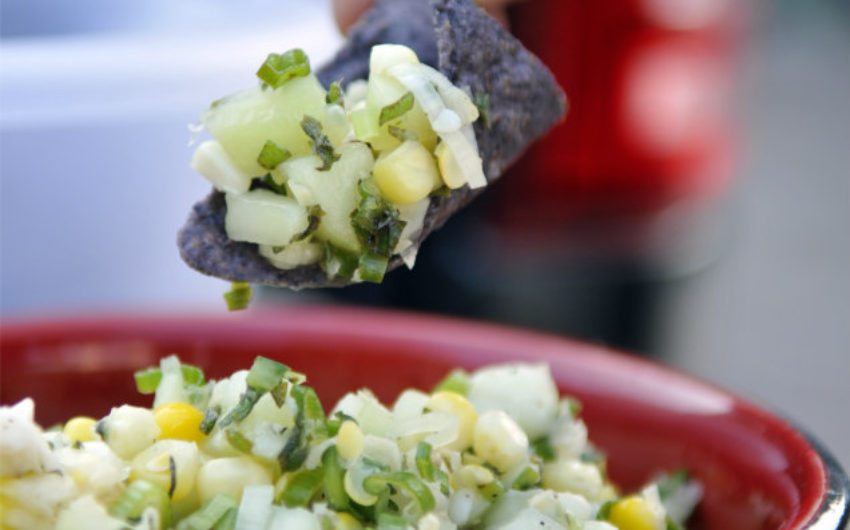 This fresh salsa makes use of sweet corn and cucumbers that are plentiful during mid- to late-summer—perfect for a hot and lighthearted pre-season game.
