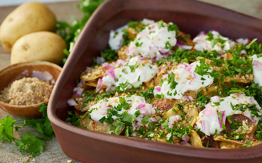To serve, top the potatoes with a generous sprinkle of dukkah spice blend followed by dollops of yogurt, onion and cilantro.