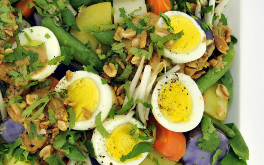 Prepare Salad: Boil potatoes in salted water until just tender and then peel. Cut into large bite-size pieces and arrange on a platter with raw and steamed vegetables of choice. Arrange eggs on top, drizzle with peanut sauce, and top with chopped peanuts and cilantro. Enjoy at room temperature.