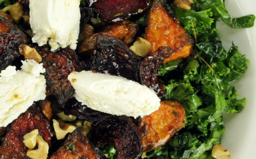 A sweet honey vinaigrette perfectly complements the earthy kale, roasted roots and goat cheese in this salad.