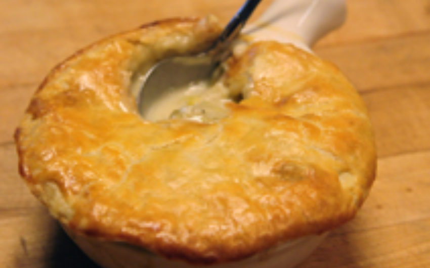 On a floured work surface, roll out the pastry dough into circles big enough to cover and slightly hang over the edge of your pot pie dishes (I use 4-inch ceramic crocks).