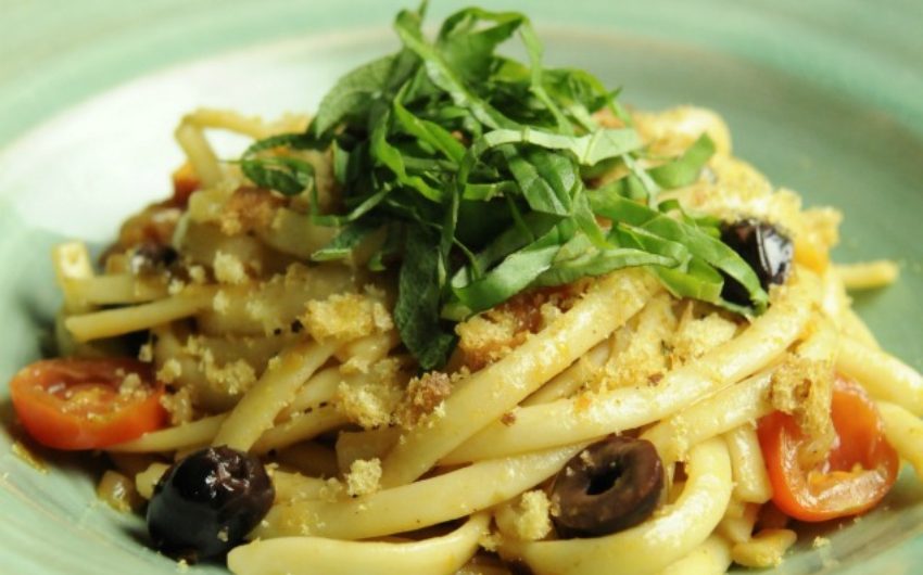 To complete the dish: Drain pasta, reserving ¼ cup of the pasta water. Add pasta and pasta water to the pan of tomato vinaigrette and gently toss with kitchen tongs. (If your sauté pan is too small to accommodate the pasta and vinaigrette, then transfer it all to a bowl to toss.) Season with salt and a number of cranks on a pepper mill, to taste. Be careful with the salt, as the capers and olives add a bit of salt to the dish already. Fold in the fresh herbs as you go. Divide pasta into 4 or 5 bowls and top liberally with garlic bread crumbs. The crunch is a pleasant surprise with each bite. Indulge and drizzle with a bit more olive oil. Enjoy!