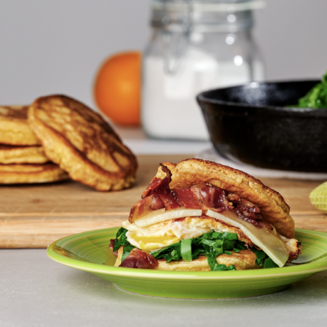 Corn Cake Breakfast Sandwich with Fried Collard Greens