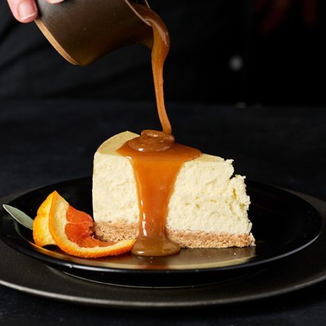 Chèvre Cheesecake with Cardamom Shortbread and Butterscotch Sauce