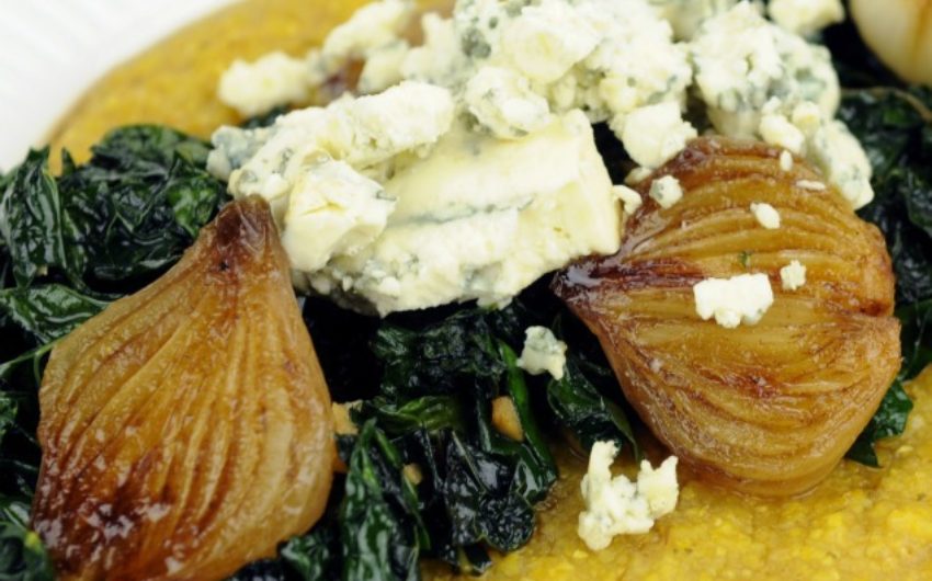 Wipe out skillet; add olive oil and heat over medium-high flame. Add kale, garlic, and chile flakes; cook, stirring often, until wilted and tender, 4 to 5 minutes. Stir in onions; add salt and pepper to taste. When polenta is done, serve it in wide, shallow bowls topped with kale-onion mixture and blue cheese.