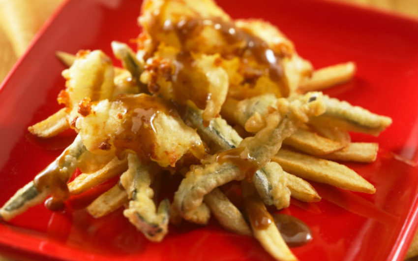 Poutine with Tempura Peppers & Harissa Sauce
