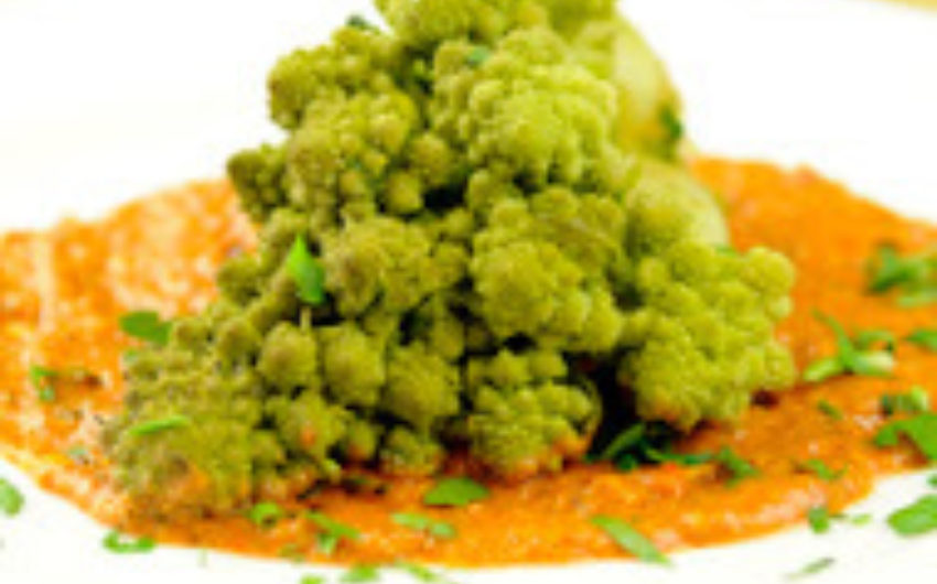 Cut Romanesco into quarters lengthwise through the X. Serve on a bed of romesco sauce, sprinkled with parsley.