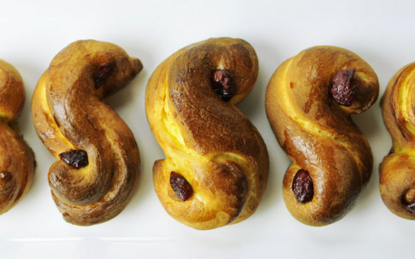 December 13 is the feast of St. Lucia, who was said to have brought food to starving Swedes during a famine. Today, to celebrate the start of Christmas festivities, fair-haired Swedish-American girls serve hot coffee and these fancy saffron rolls.