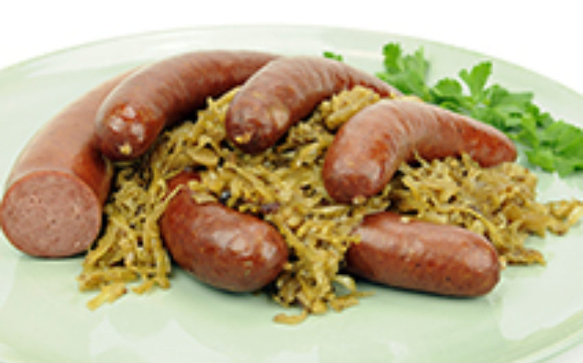 Portion sauerkraut onto individual plates. If you haven’t already done so, cut the sausages. Top sauerkraut with 1 portion of each sausage type, sprinkle with parsley and serve with additional mustard. Uff-da.