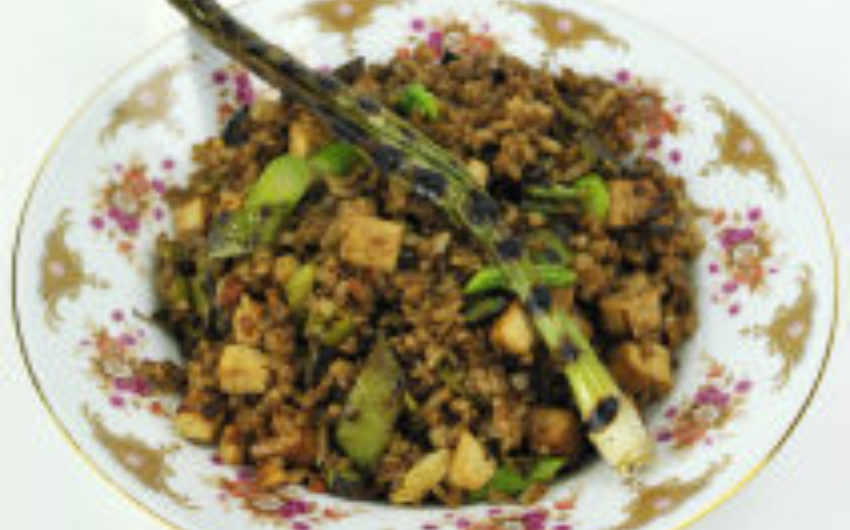 Keeping the flame high, add another tablespoon peanut oil, wait 10 to 15 seconds and then add rice. (If the rice is clumpy, break it up as you add it.) Let mixture cook undisturbed for a minute or so, then scrape it up and toss it well.