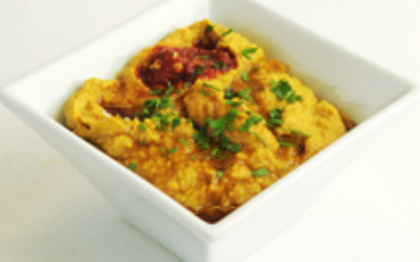 Harissa, a spicy North African chili paste adds an addictive burn to this curious and delicious dip.