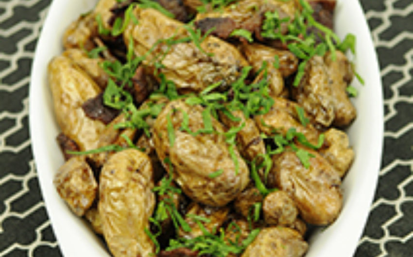 To crack fingerlings, smack each one with the flat of a broad knife (if potatoes “smash,” you’re hitting them too hard). Toss with 1 to 2 tablespoons bacon fat. Place in single layer in baking pan; roast until tender, about 40 minutes.