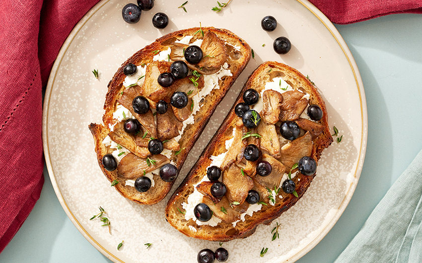 Spread as much goat cheese as you'd like across the bread slices, and top them with mushrooms, a few pickled blueberries and a pinch of thyme.
