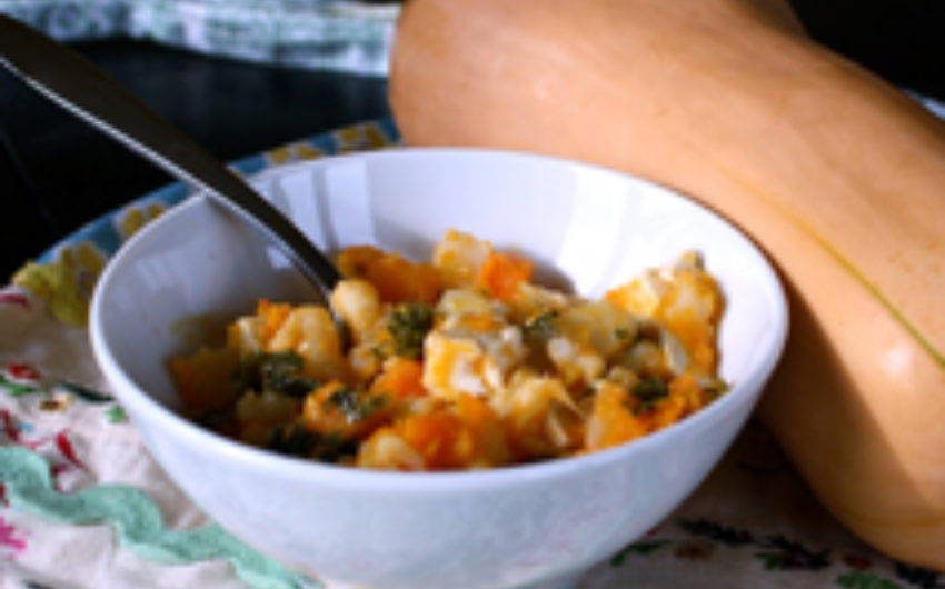 Melt coconut oil over medium heat in a large skillet with a lid Add garlic and cook until fragrant, 1-2 minutes. Add squash, cauliflower, potatoes, and a pinch of salt. Stir to combine.