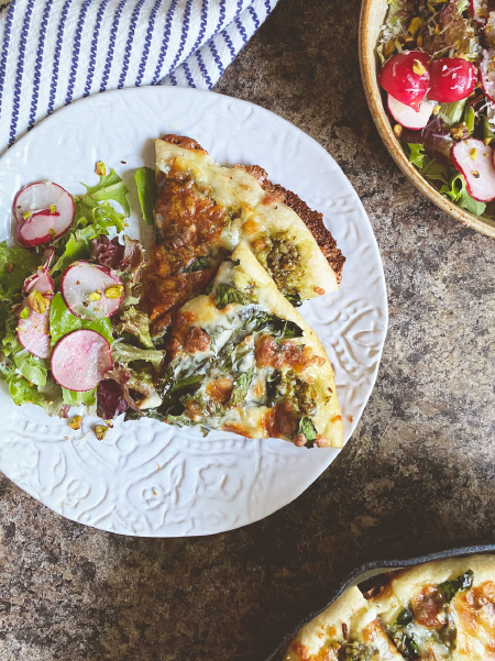 PIZZA WITH GREEN GARLIC PESTO & SPINACH