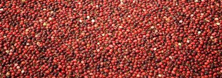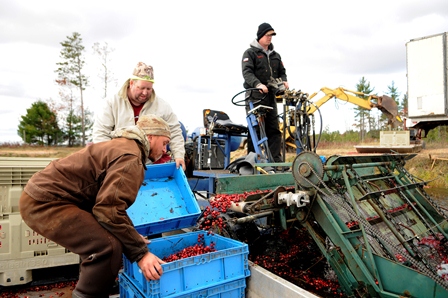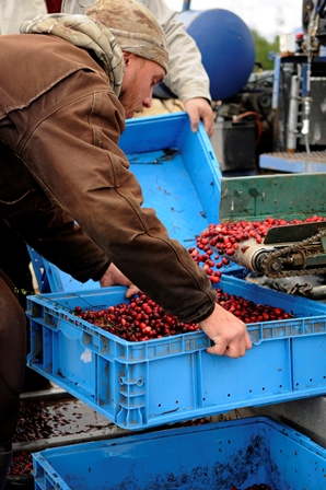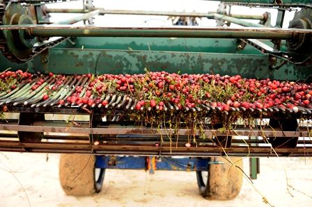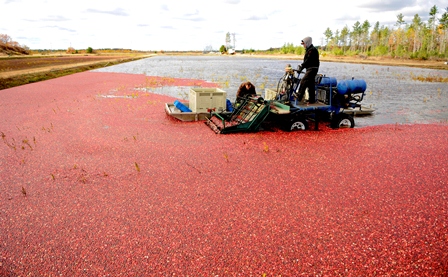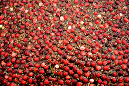 Once mature, each cranberry contains a tiny pocket of air, which aids in harvesting. Machine-made commercial bogs are flooded at peak ripeness, when the fruit easily detaches from the vine or is “beaten” from the vine with specialized equipment. The berries float to the surface where they are corralled and either hand- or machine-harvested. The fruit is then transported by truck to a sorting, packaging and distributing facility to be prepared for fresh sale or processed into frozen berries, juice, sauce, powder, or sweetened and dried.