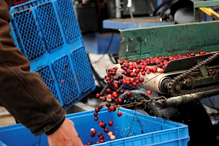 A second, less common harvesting method is a dry harvest, where the fruit is “combed” from the vine using specialized picking equipment, which requires no water.