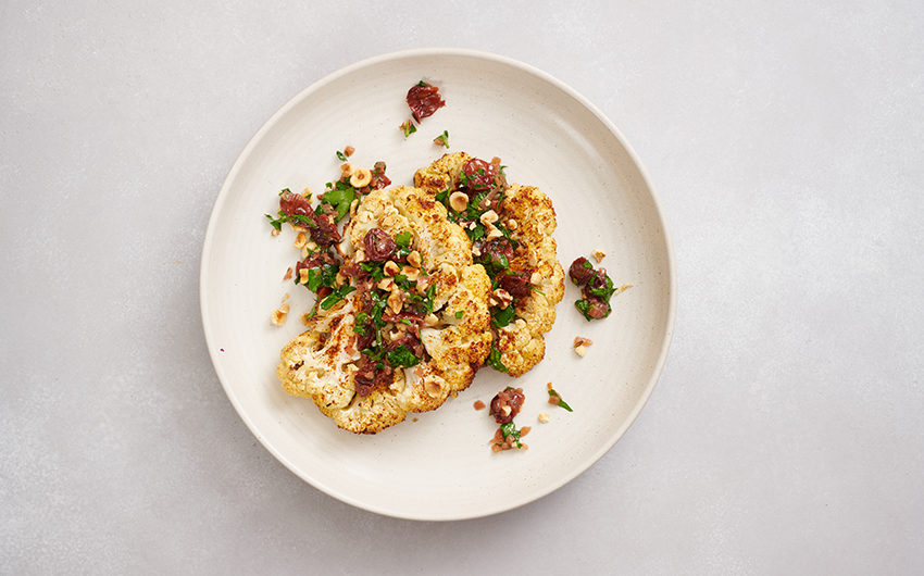 Roasted cauliflower has always been Michelle Dubis’ go-to for a vegetarian entree to serve at events or at home. She loves bold flavors that come forward when roasted on high heat. This recipe pairs the robust flavor of caramelized, spiced cauliflower with cherries, herbs and nuts to yield a well-balanced, beautiful plate filled with colors and textures.