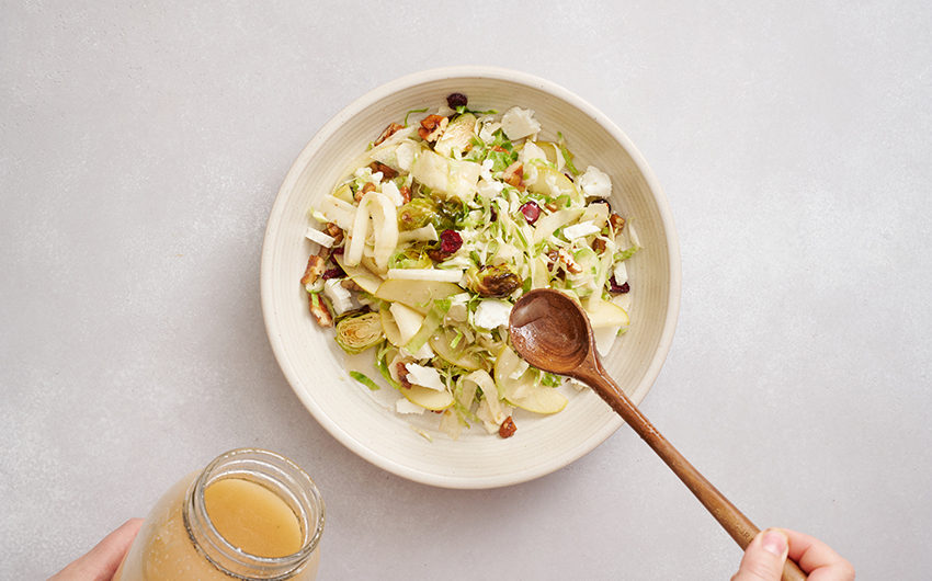 Adam Struebing has always been passionate about using local food to build big flavors. He loves giving attention to each unique ingredient in a way that makes it come alive. His candied pecans and pickled apples in this recipe exemplify this approach, but if you are short on time, toasted nuts and fresh sliced apples will suffice. For the best flavor, Struebing loves to use tart apples from Door Creek Orchard and always asks second-generation owner Liz Griffith what she thinks will work best for a particular recipe.