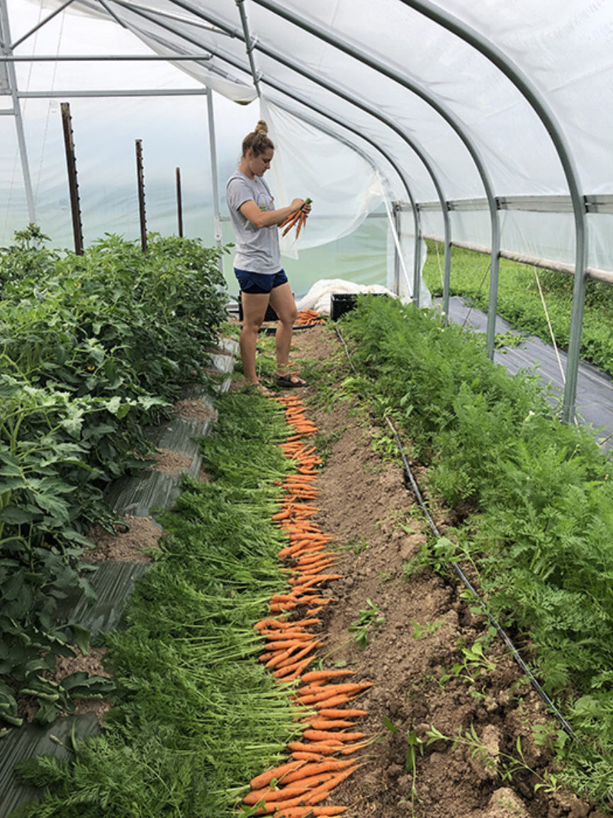 Garden-ripe tomatoes, another quintessential summer crop, are also grown in a protected environment at Blue Heron Community Farm in Reedsville, where farmer Alex Young isn’t shy about his feelings on hoop houses. “They are great tools for farmers in the Midwest,” says Young. “I am full-on in love with them. I think they are the greatest things on earth.” A hoop house, also sometimes known as a high tunnel, is a covered structure usually consisting of a steel frame and heavy-duty plastic that protects plants from harsh weather and can be used to extend the growing season. Young says using a hoop house for tomatoes, his farm’s number-one crop, has been a game changer. “The biggest thing is predictability…We can plant tomatoes the first week of April no matter what,” Young says. “In eight seasons on our farm, the outdoor soil conditions the first week of April have varied a lot, some years we get 12 inches of rain and we can’t even get in the fields, and last year it was warm in February, but when you have a hoop house, you are guaranteed the soil will be dry and the temperatures will be warm enough that you can get in and plant.”