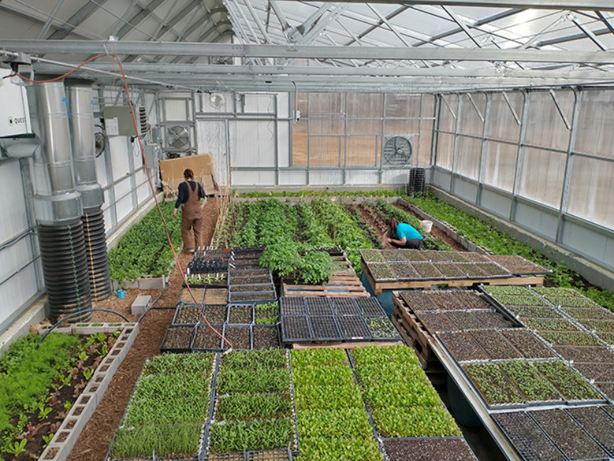 Farmer Bethanee Wright of Winterfell Acres says that climate change was one of the main reasons she started farming. “I felt like it was a tangible way that I could make a difference with all of the earth changes that it feels like we are experiencing,” she says. Having grown food for 15 years, now in her 12th season of owning her own farm, Wright says she has experienced “way more intensity” when it comes to the weather. “It’s not that it’s been drier or overly wetter, it’s that every year is different and it’s been amplified,” she says. “There have been several years where I lost crops because it was too wet.” Frustrated with the limitations that come with growing outdoors in fields, Wright received a grant to build a high tunnel and in the first year grew “3,000 or 4,000 pounds of produce,” she says. “I could start having a spring CSA, I was selling April through November, depending on frost, to my chefs…That was my first, ‘Oh wow,’ instead of having to make all of my income basically June through October, I can extend that.” While excessive amounts of rain can devastate crops, “it’s never a problem in the high tunnel or greenhouse,” Wright says. “It’s always easier for me to add water through irrigation but you can never take water away.” Sold on the high tunnel, next Wright and her husband decided to build a greenhouse using a geothermal kit that uses passive solar to heat the space where she now can grow greens and herbs throughout the winter which she sells to Madison-area chefs. While propane is used in the spring to start seedlings, the majority of the year the greenhouse uses the earth's natural heat to provide heating and cooling. “It’s like a zone 8/9, think like southern Georgia or more Mediterranean,” Wright says. “So, it’s like Italy, which is just delightful.”