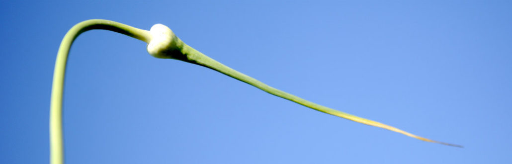 Crop improvement is gratifyingly easy as well. The bigger the cloves that you plant, the bigger the future heads and cloves within that head will be as well. And there’s a bonus in the middle of this cycle: in the early summer, before the heads mature for harvest in August, the plants will send up flowering stems, called scapes. You need to break off the scapes so all the plant’s energy can go back into the maturing head underground, and they’re not only edible but a delicious and timely substitute for garlic after your stored garlic is gone and before your fresh garlic is ready. Pretty cool, right?