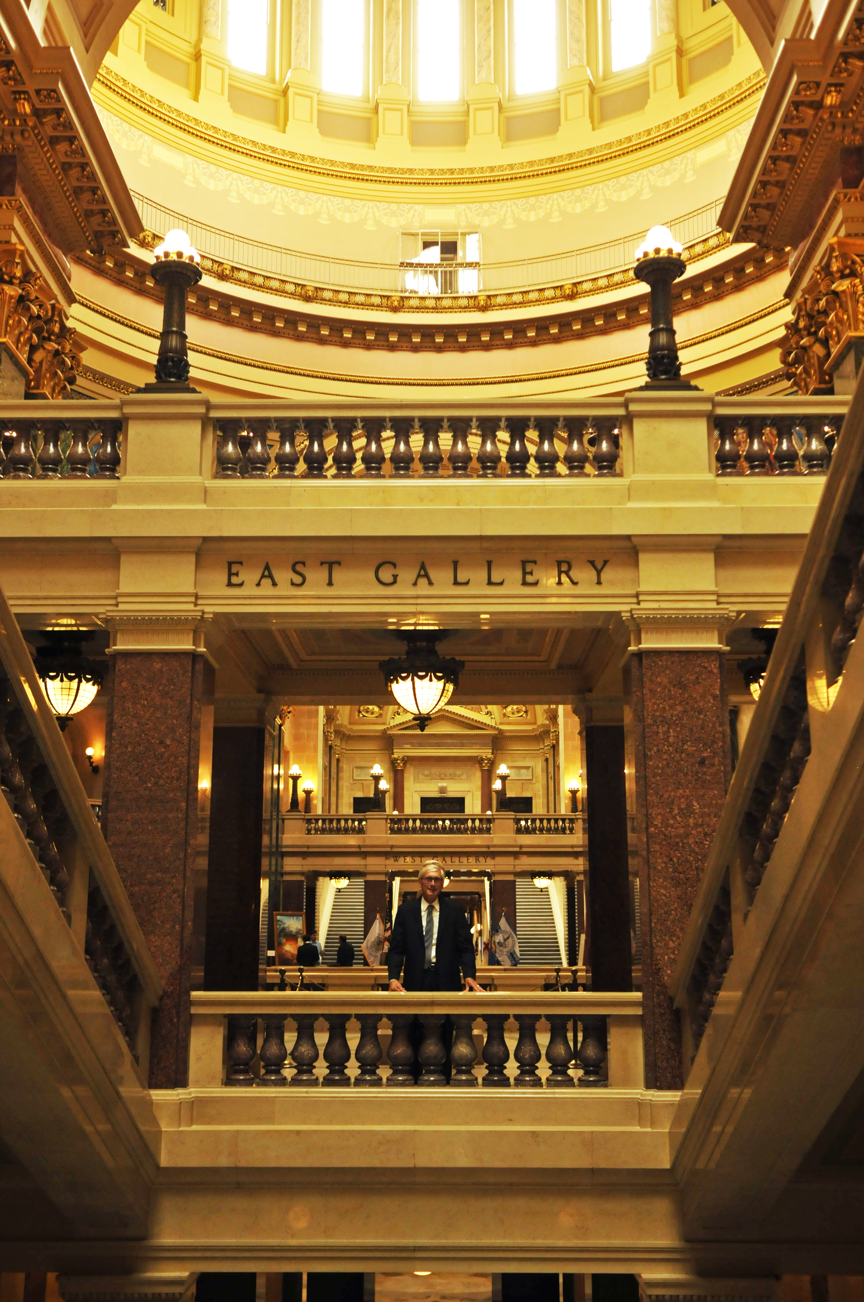 Once inside this awe-inspiring structure, irony slashed down like bats. It’s so dark. Literally. Although the central floors under the rotunda are somewhat lit, from indeterminate sources, venture far into one or another of the four wings, as we did to reach the Governor’s conference room, and you’re going to need a flashlight and reflective floor tape. But oddly enough, given the setting, we witnessed no demise of democracy. Its pulse was strong.