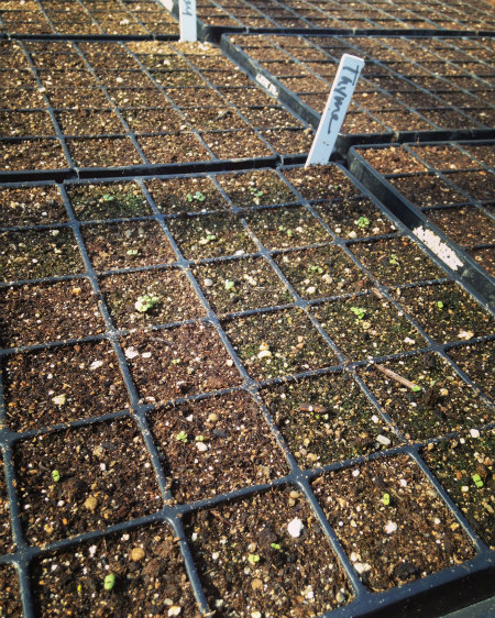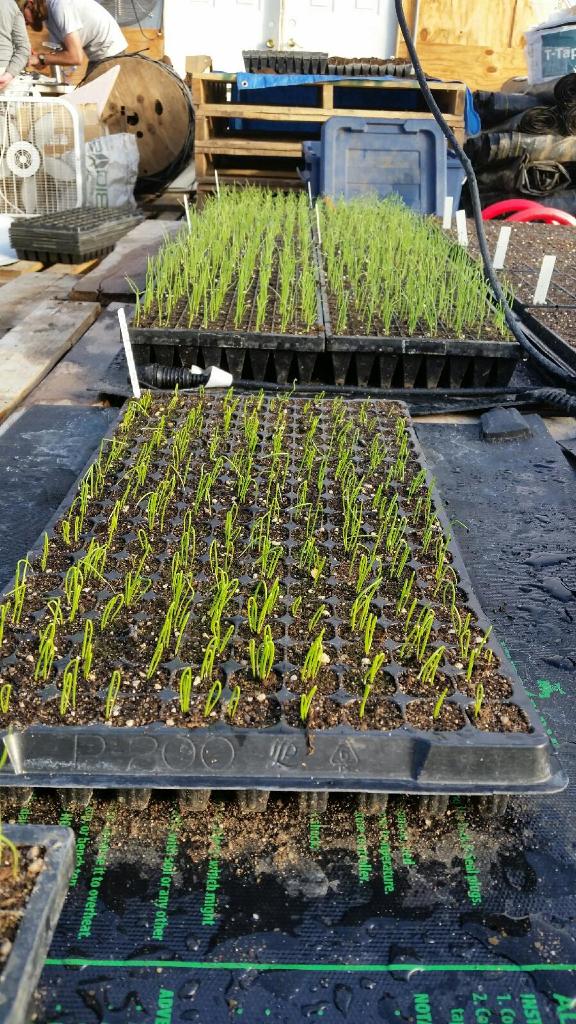 The trays are stacked high between us on one of the few empty spaces on the greenhouse floor. Kyle moves to watering. I grab the first tray from the stack and make small impressions in the soil. Once the dimples have been made, I work fast but precisely, dropping one seed into each tiny square of soil. My hands work in tandem, down one row and up the next until all 200 cells have been sown. I feel relaxed in the rhythm. Seeded trays return to the tarp where Kyle covers them with soil, again with that firm tenderness only he can perfect. Finished trays move to heating mats for germination and are watered with a gentle stream from the watering can.