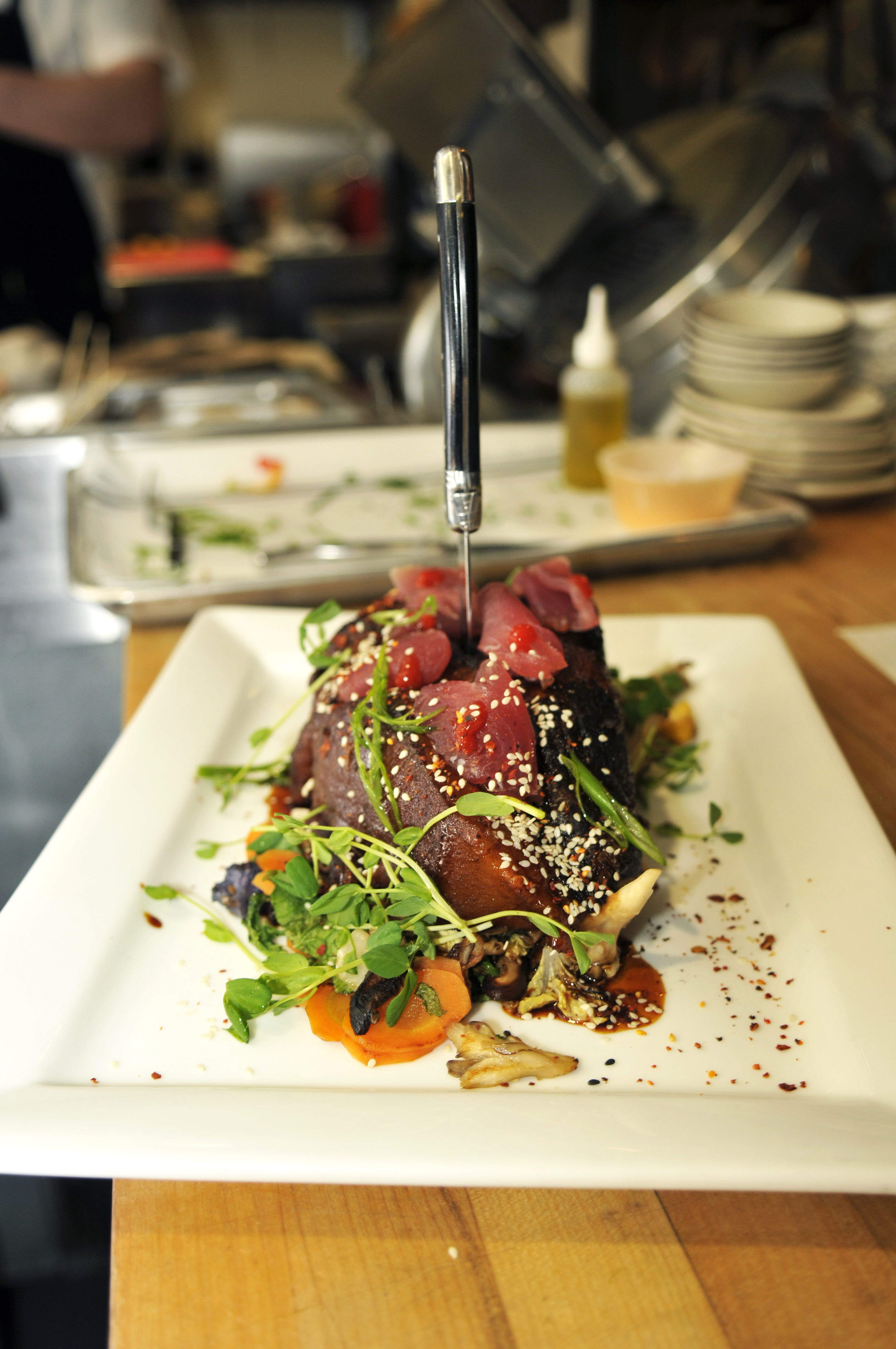 It was electric to witness it all come together—each plate making its final stop at Chef Dan’s warmly lit, butcher block station overlooking the front of house where he carefully made final touches before sending it out to the table. This is the spot where time sort of stops and his artistic vision manifests, sprinkled with kind words about his amazing team and the farms where he sources his ingredients.