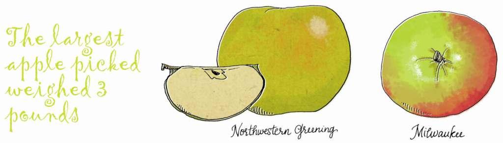 Fortunately for market-goers, antique Wisconsin-developed apples tend to be naturally tarter, making them good for cooking and storage, like the large Wolf River mentioned previously, which was developed in Fremont in 1881. The Newell’s Winter (or Orange Newell) originated in Sauk County in 1849 and has a coarse texture and a nicely acidic flavor. The McMahon apple was first planted by a woman in Richland County in 1860 and is another very large apple good for desserts. Northwestern Greening was developed in Waupaca County and is the most popular non-red apple grown in the Midwest. It is very juicy with firm flesh, excellent cooked into sauce or pies, and is a good storage apple.