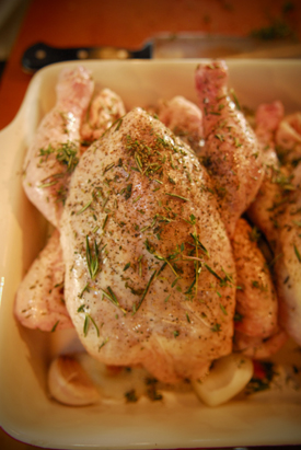 As the warm months come upon us, I have joined Monique, author of Cooking with the Seasons, to experience her take on what the summer bounty has to offer. Today we’re making roasted chicken, ratatouille and a plum tart. Laid out before us are two young birds, fresh herbs and tender garlic, tomatoes, zucchinis and more, and we begin by loosely pulling herbs from their stems, seasoning the chickens liberally. Monique strokes the herbs against the grain to open up their oils, which immediately sends their savory aromas wafting throughout the kitchen.