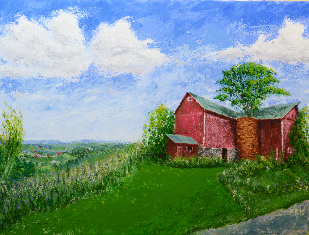 On a ridge that crosses the northern border of Sauk County sits this unusual barn of perpendicular design. A palette knife acrylic painting by Wisconsin artist Andy Radtke harmonizes its perch with a rolling, driftless distance in Morse-like dots and dashes of color. This survivor barn, constructed near the turn of the twentieth century, is a local landmark as much for its proximity to a hairpin curve in the road, as for the determined elm that has grown up out of the clay brick silo tucked into the crook of the barn's elbow.