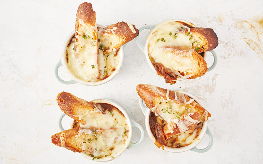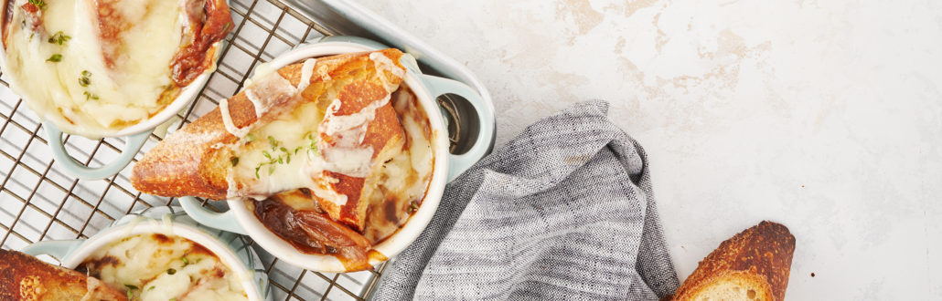Delicious Wisconsin-made cheeses transport you across the globe in these two simple yet stunning dishes. Roth Grand Cru® and Gouda make this French onion soup irresistible on a chilly fall evening, and the bacon-wrapped dates stuffed with Roth Buttermilk Blue® make a perfect appetizer for fall and winter entertaining.