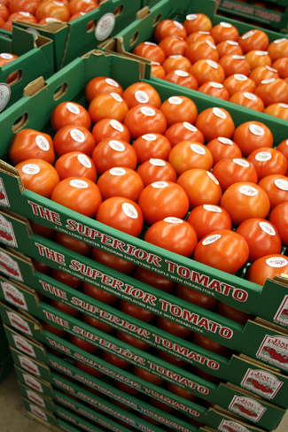 Employees thin out plant leaves and fruit, so the produce that remains will grow to the desired size. Then they pluck what is ready for shipment. Others sort the harvest by size and quality, prepare boxes for packaging, add stickers to single-sale tomatoes and peppers. They weigh the finished products, be it cases or four-packs of the beefsteaks, or eight-ounce containers of grape tomatoes.