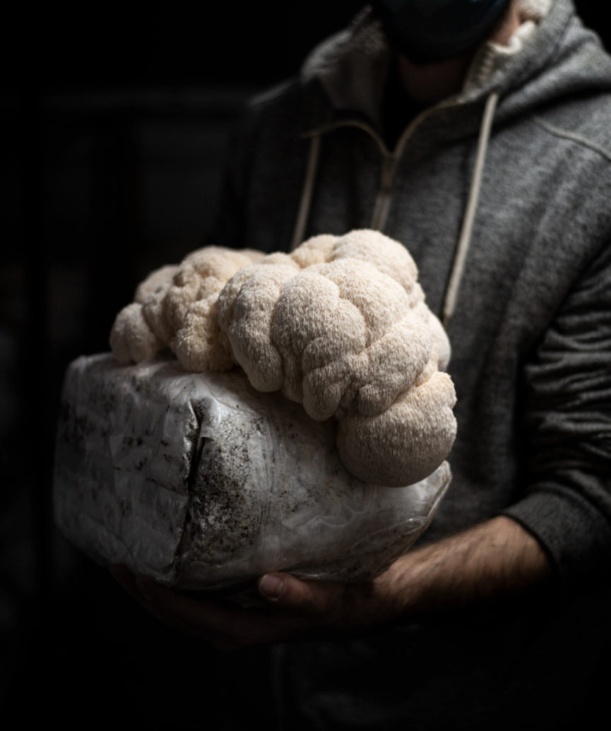 Another Madison-area farm excelling in mushrooms is Vitruvian Farms in McFarland. As co-founders Shawn Kuhn and Tommy Stauffer guide me through their well-organized incubation rooms, they point out a specific mushroom variety that has been particularly popular: lion’s mane. “People are really starting to get excited both on the restaurant level and at farmers markets about lion’s mane. There’s been a lot of conversation about its effects on the mind and general health benefits,” explains Stauffer. Kuhn adds: “Preliminary studies have found that it helps regenerate the myelin sheath, which is a fatty protective layer on the long arm of the neurons. The more insulated that is with fat, the better your electrical signals fire.” As I mull over this fact, surrounded by shelves of the shaggy, alien-like orbs bulging out of sawdust bags, I can’t help but notice how similar the mushrooms look to brains themselves, and I wonder if the visual resonance has any evolutionary, ancestral relation to our own neural networks.