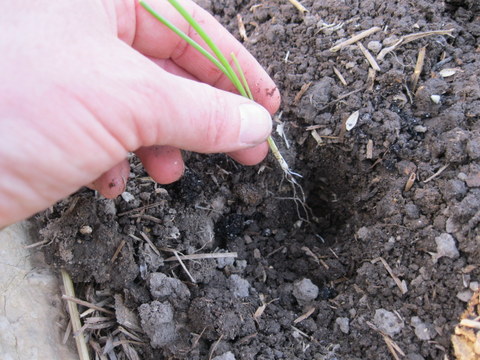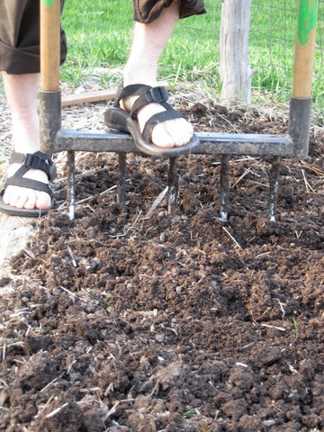 This past weekend we planted about 500 onions in our garden. Because onion seedlings are small and prefer loose soil, we decided to prep the soil before planting. We scraped off the hay mulch and used two of our favorite tools to loosen the soil. The first is a broadfork (see image at right), which you can insert into the soil to aerate it on a deep level without disturbing the soil structure. The second is what we often call “The Don” after the first person we saw use it, but in reality is called a 4-tine cultivator. This tool is more for surface prep, breaking up and smoothing out those clods of clay that many of us have in our garden. All of this prep and planting took less than two hours since we had already set up a good foundation with permanent beds and paths that had been well mulched for the long winter.