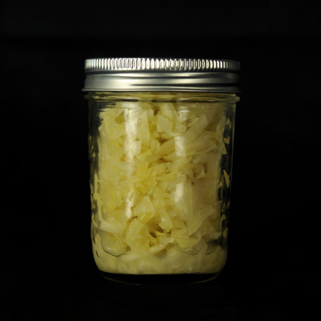 If you want to try your hand at cultured foods, sauerkraut is the easiest place to begin. First, start with organic cabbage, which I always encourage over conventionally grown. We have awesome local farms here in Southern Wisconsin that would be great sources, and they may even sell you “seconds” that aren’t as pretty but would still make great kraut. The only other ingredient you’ll need is fine-grained, unrefined sea salt with no iodine or other additives. Little equipment is needed other than a glass jar with a lid, though you could make a larger batch in a ceramic crock if desired.