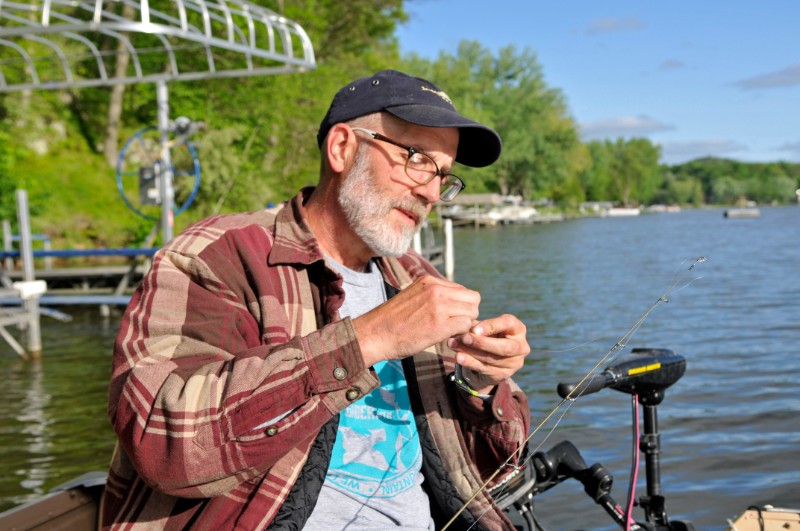 I check the clock. One-fifteen, lunchtime for the three-dozen die-hards who paid $18-a-head at 7:00 a.m. for the blustery privilege of dropping three-quarter-ounce, feathered jigs to the slanting river-bottom where turned-on walleye gather to feast. I’m fishing the barge’s other side, my hook on the bottom for yellow perch, but my eye is on the walleye hunters. Every stinking cast they have something on the line.