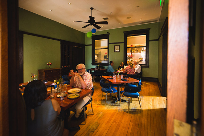 The old blonde wood floors are well-worn and scratched from lots of chairs being pulled in and out and children’s feet. The building has only two rooms: a high-ceilinged dining room and a kitchen which, according to Spicer and Beach, has some serious limitations.