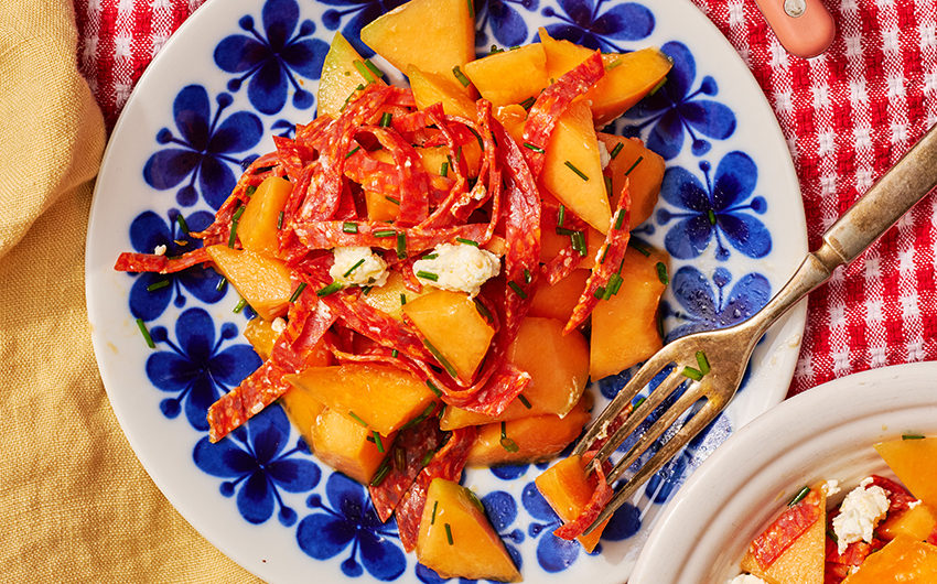 The garden produces nothing more aromatic and sweet than cantaloupe. When creating this savory salad, Joseph Meyer wanted to harmonize with that natural sweetness instead of fighting it. By pairing cantaloupe with abundant chives, fresh goat cheese and ever-so-slightly-spicy salami, you wind up with flavors that round out the palate. This savory salad makes a wonderful first course, pleasantly unique potluck item or unexpected brunch dish.